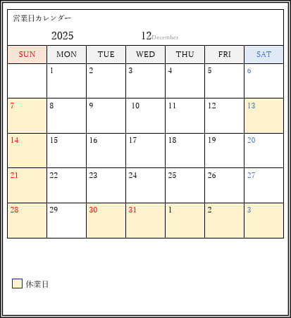 当社の12月の営業日および休業日についてご案内申し上げます。